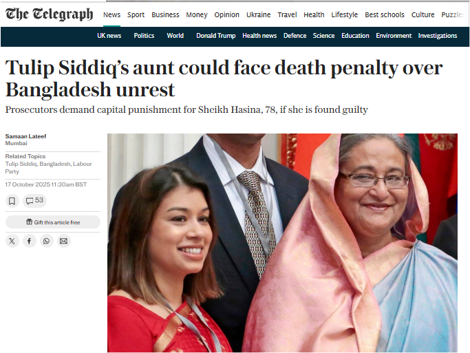 ব্রিটিশ লেবার পার্টির এমপি টিউলিপ সিদ্দিকের খালা ৭৮ বছর বয়সী শেখ হাসিনা বর্তমানে বাংলাদেশের আন্তর্জাতিক অপরাধ ট্রাইব্যুনালে বিচারাধীন। প্রসিকিউশন দাবি করেছে, “প্রদর্শিত প্রমাণ অনুযায়ী, তিনি সরাসরি হত্যাকাণ্ডের নির্দেশ দিয়েছেন এবং মৃত্যুদণ্ড প্রাপ্য।”