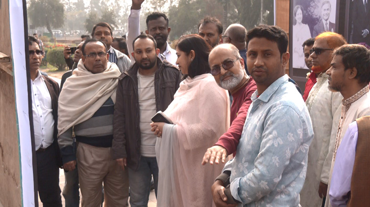 শনিবার (১০ জানুয়ারি) দুপুরের দিকে হঠাৎ কোনো প্রটোকল ছাড়াই জিয়া উদ্যানে হাজির হন প্রয়াত কোকোর স্ত্রী শর্মিলা রহমান। প্রদর্শনীতে থাকা ছবিগুলো ঘুরে দেখেন প্রয়াত কোকো’র স্ত্রী শর্মিলা রহমান।