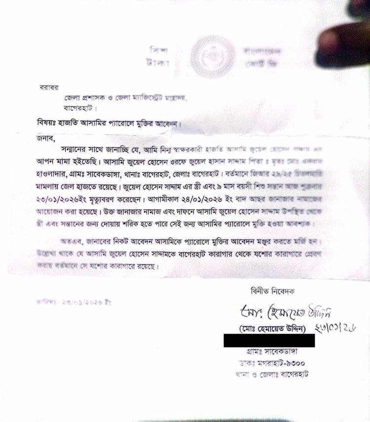 এদিকে সাদ্দামের প্যারোলে মুক্তির আবেদনের বিষয়ে যশোর জেলা প্রশাসকের মিডিয়া সেলের সহকারী কমিশনার আশীষ কুমার দাস স্বাক্ষরিত এক বিজ্ঞপ্তিতে বলা হয়েছে, বাগেরহাট কারাগার থেকে ২০২৫ সালের ১২ ডিসেম্বর যশোর কেন্দ্রীয় কারাগারে আগত বন্দী জুয়েল হাসান সাদ্দাম নামের ব্যক্তির স্ত্রী ও সন্তানের মৃত্যুর ঘটনায় পরিবারের পক্ষ থেকে বিজ্ঞ জেলা ম্যাজিস্ট্রেট, যশোর কিংবা যশোর কেন্দ্রীয় কারাগার কর্তৃপক্ষ বরাবর প্যারোলে মুক্তির কোনো ধরনের আবেদন করা হয়নি। বরং বিভিন্ন সংবাদমাধ্যমে পরিবারের বক্তব্য থেকে জানা যায়, সময় স্বল্পতার কারণে তাদের পারিবারিক সিদ্ধান্তে প্যারোলে মুক্তির আবেদন না করে জেল গেটে লাশ দেখানোর সিদ্ধান্ত নেওয়া হয়। ফেসবুকের বিভিন্ন পোস্টে উল্লিখিত বন্দীর স্ত্রীকে লিখিত চিঠি ও কারাগারে বন্দী অবস্থায় ছবি দেখা যাচ্ছে, যা যশোর কেন্দ্রীয় কারাগারের সঙ্গে সংশ্লিষ্ট নয়।