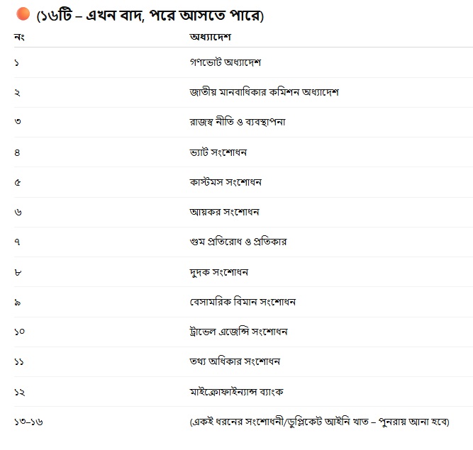 ১৬টি অধ্যাদেশ এখনই বিল আকারে না এনে পরবর্তীতে আরও শক্তিশালী করে নতুনভাবে উপস্থাপনের কথা বলা হয়েছে। এর মধ্যে রয়েছে মানবাধিকার, রাজস্বনীতি, গণভোট, দুর্নীতি দমন কমিশন ও তথ্য অধিকার সংক্রান্ত গুরুত্বপূর্ণ আইন।