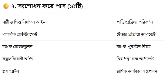 এ তালিকায় বাংলাদেশ ব্যাংক (Bangladesh Bank), জ্বালানি নিয়ন্ত্রণ কমিশন, সাইবার নিরাপত্তা, বিশ্ববিদ্যালয় আইন সংশোধনসহ নানা গুরুত্বপূর্ণ বিষয় অন্তর্ভুক্ত রয়েছে।